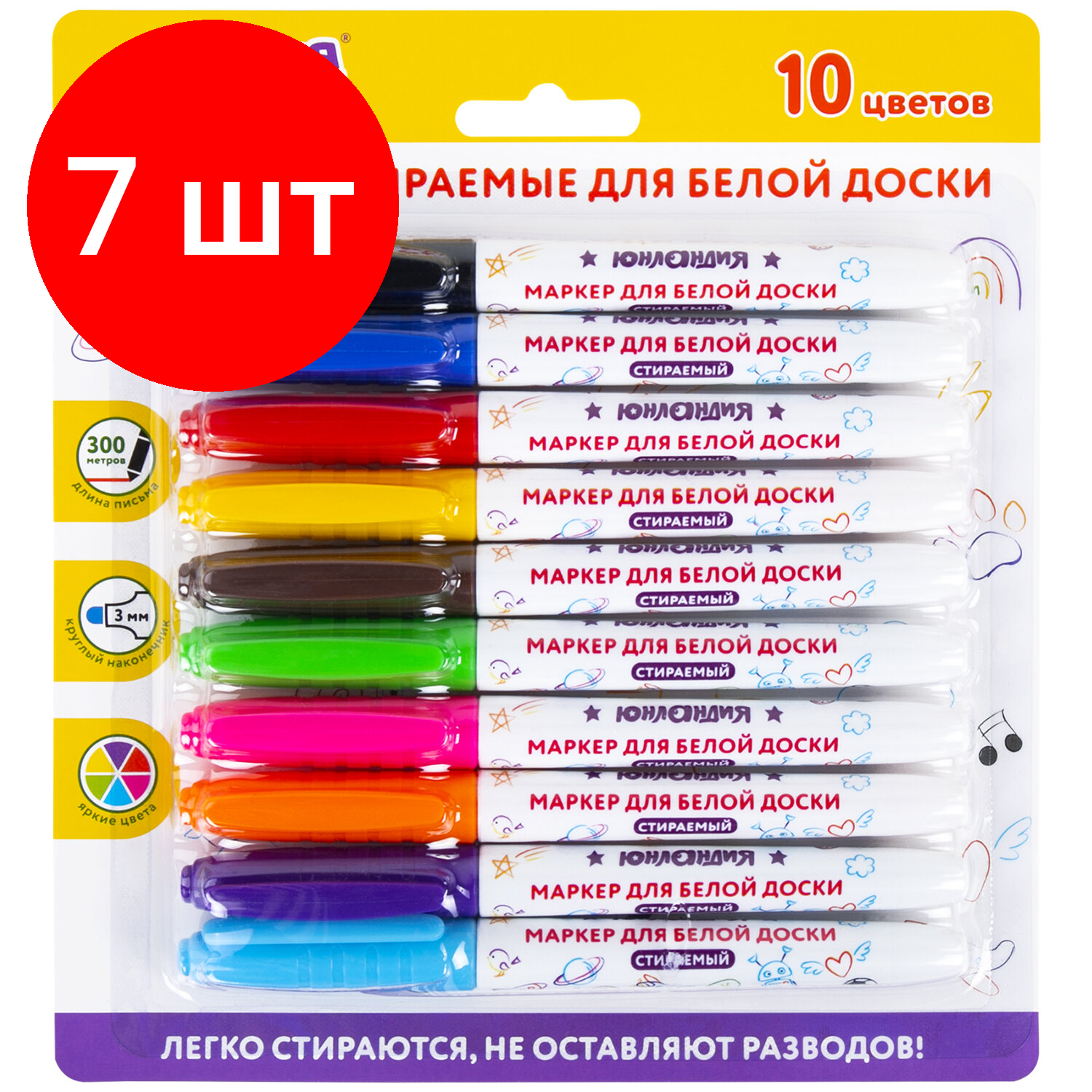 10 цен на Комплект 7 шт, Маркеры стираемые для белой доски набор 10 цветов, юнландия "COLORWAY", 3 мм, 152100