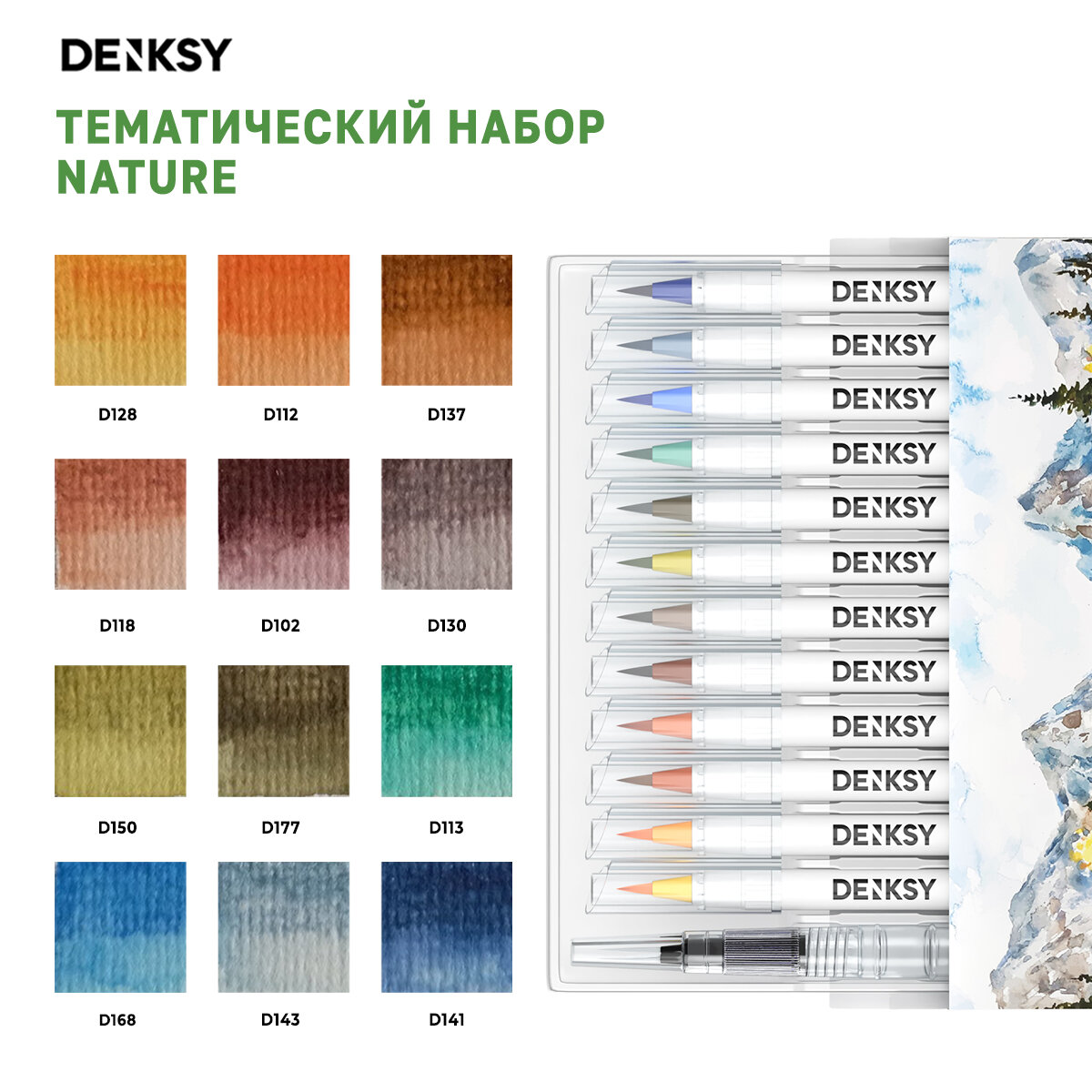 Акварельные маркеры DENKSY 12 Nature цветов в белом корпусе и 1 кисть с резервуаром информация: