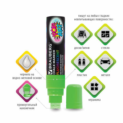 Маркер меловой "POP-ART" зеленый, 15 мм, сухостираемый, для гладких поверхностей, BRAUBERG, 151542 информация: