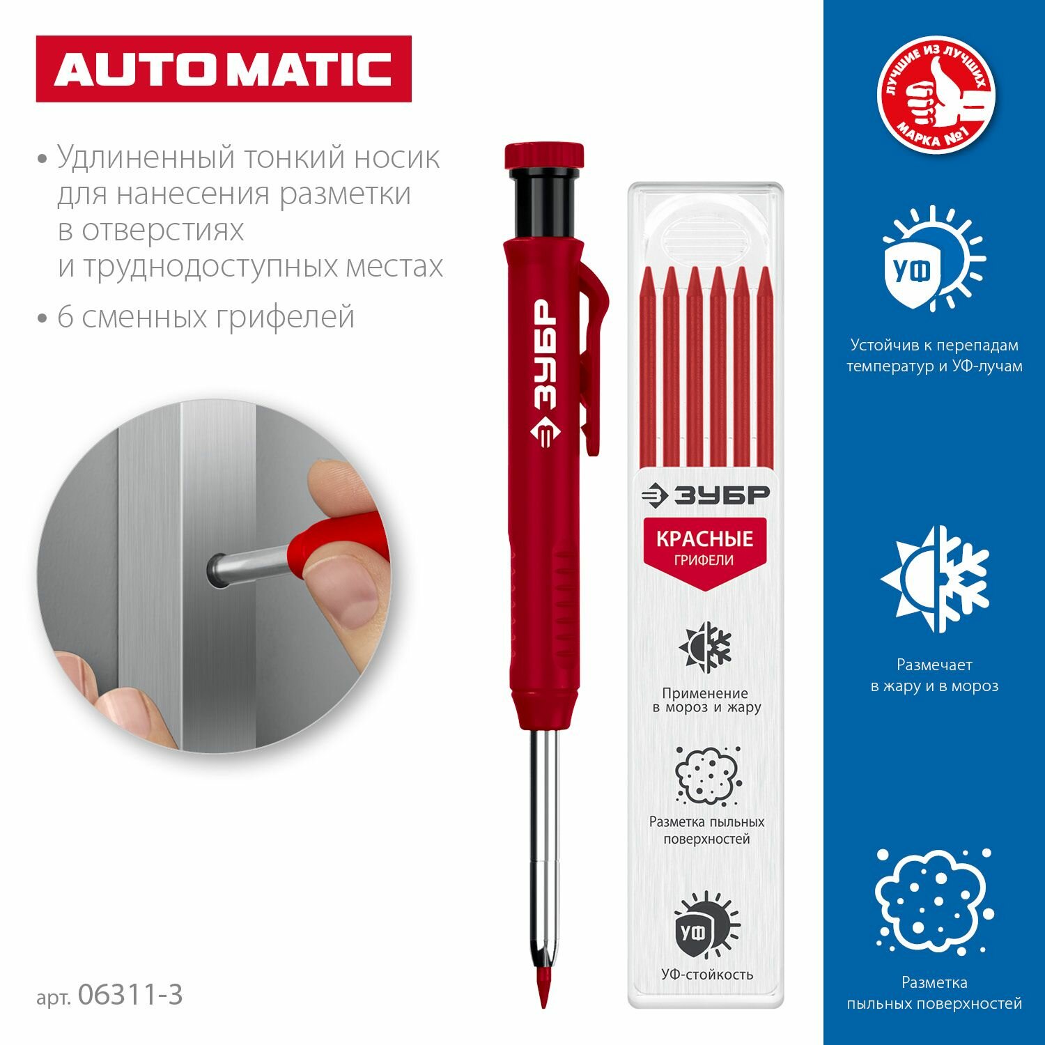 10 цен на Автоматический строительный карандаш ЗУБР, красный, HB, 6 сменных грифелей, АСК, серия Профессионал