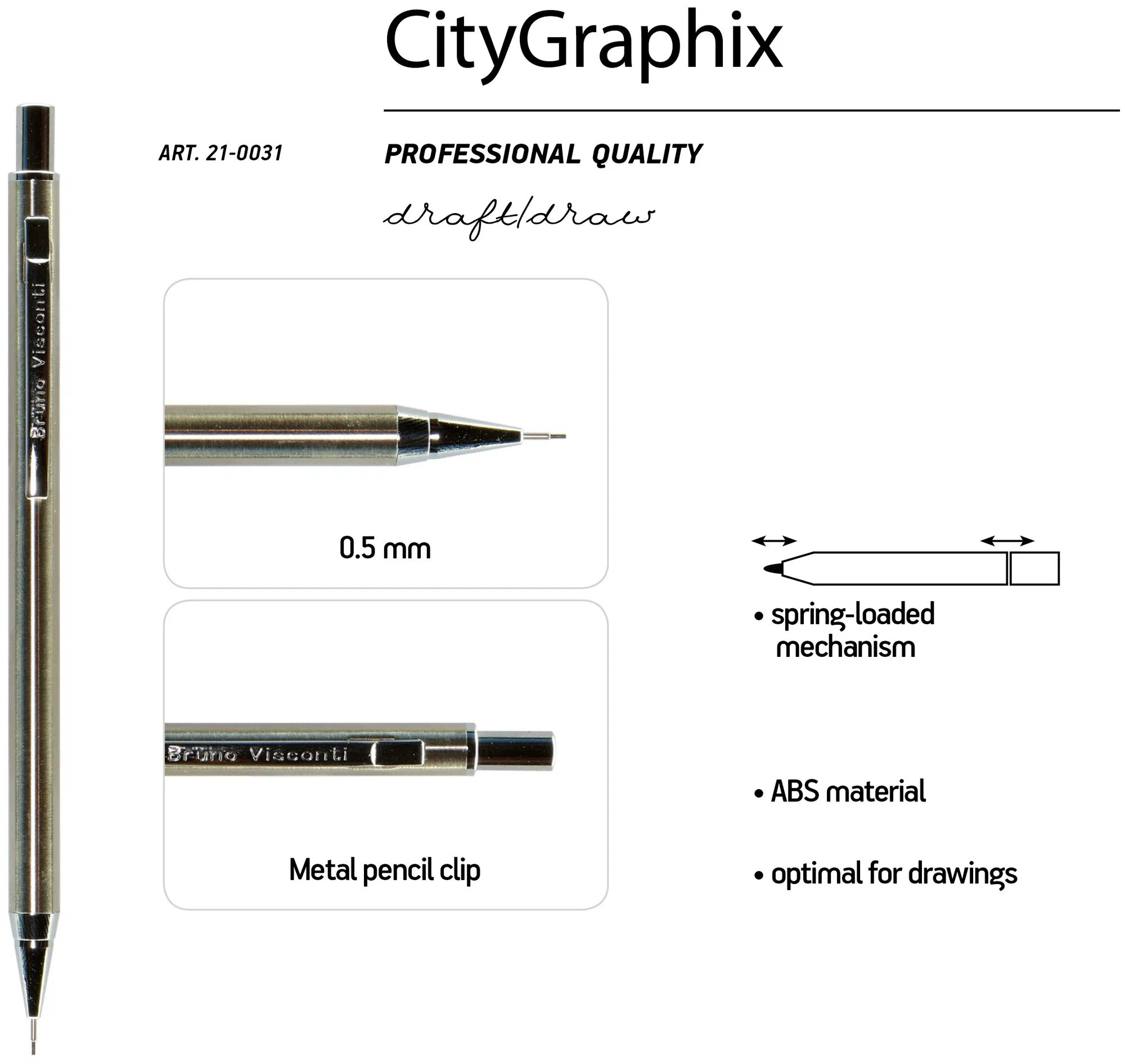 Карандаш Bruno Visconti, круглый, металлический, ластик, серебристый, 0.5мм информация: