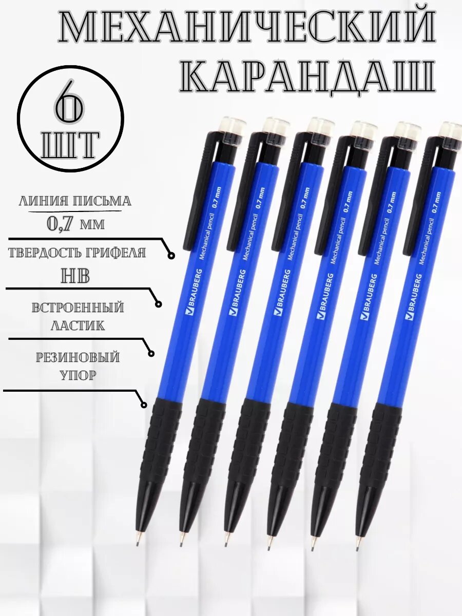 10 цен на Карандаш механический BRAUBERG "Comfort", твердость HB, с ластиком, линия письма 0,7 мм, 6 штук