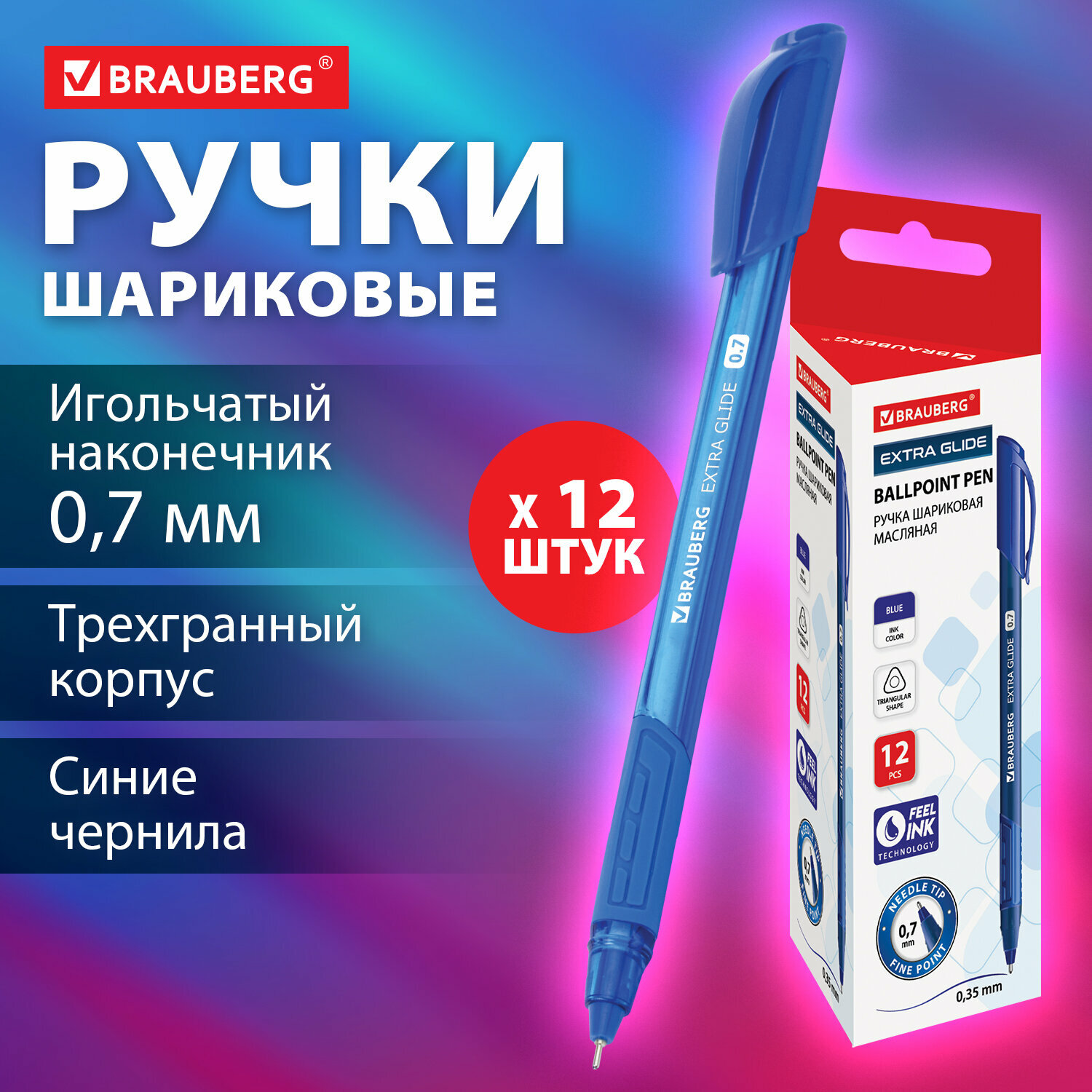 Ручка шариковая Brauberg Extra Glide Gt Tone, синяя, Выгодный Комплект 12 штук, узел 0,7 мм, линия письма 0,35мм, 880733 информация: