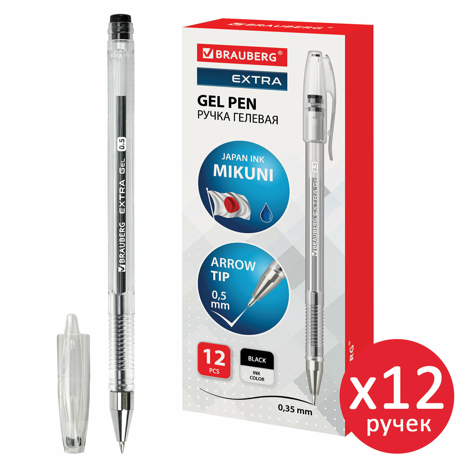 Гелевые ручки черные набор 12 штук, для ОГЭ, ЕГЭ и школы тонкие, узел 0,5 мм, линия 0,35 мм, Brauberg Extra, 881013 информация: