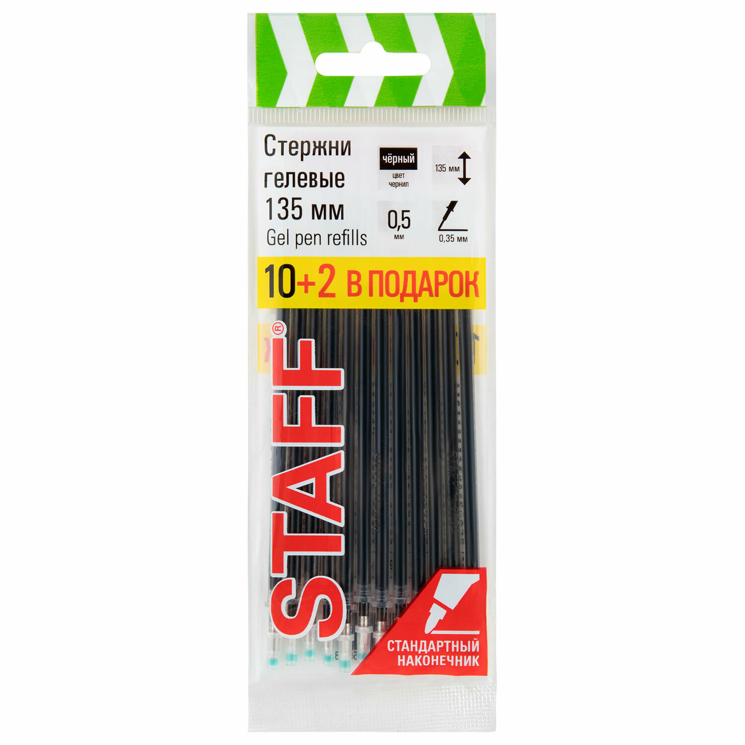 10 цен на Стержни для гелевых ручек черные 135 мм набор 12 штук, игольчатый узел 0,5 мм, линия письма 0,35 мм, Staff, 170411
