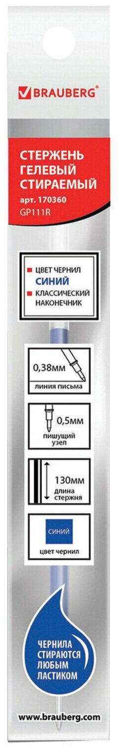 Стержень стираемый гелевый Brauberg 130 мм, Комплект 20 штук, Синий, узел 0,5 мм, 880229 информация: