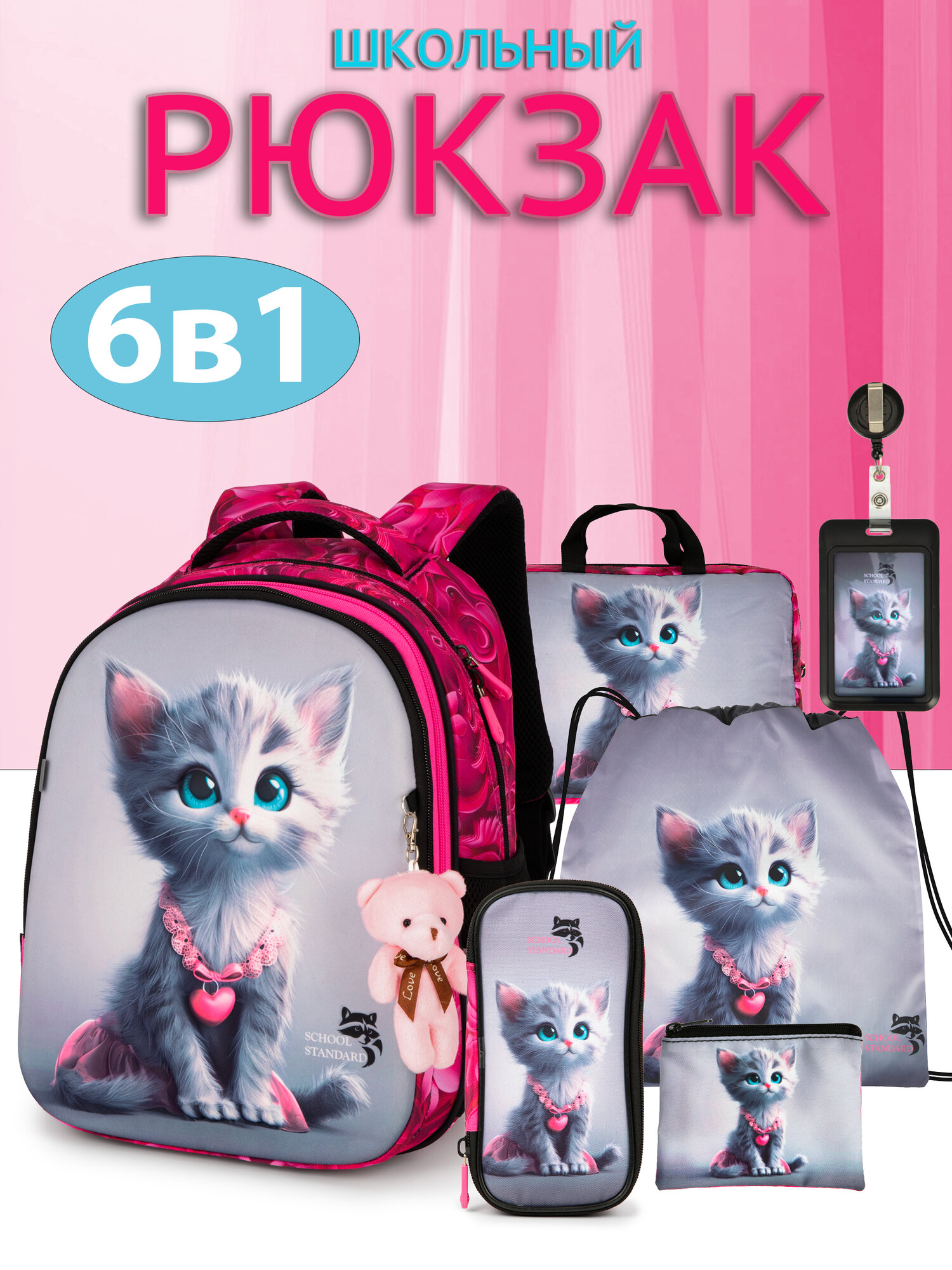 Рюкзак школьный для девочки младших классов анатомическая спинка, набор 6 в 1 + брелок, School Standard (Скул Стандарт) информация: