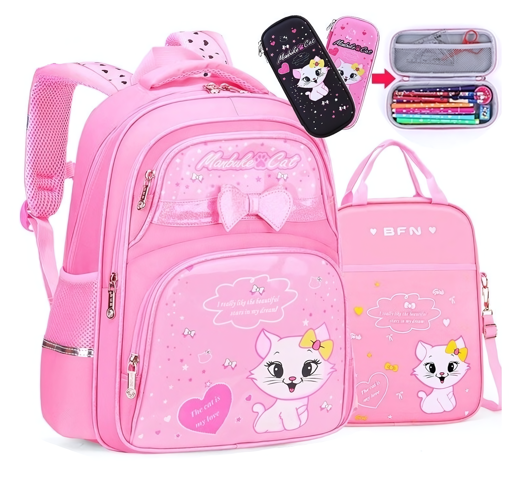 Отзывы на Рюкзак школьный для девочек, 3-6 класс + сумка для занятий + пенал, розовый с принтом "кошки"