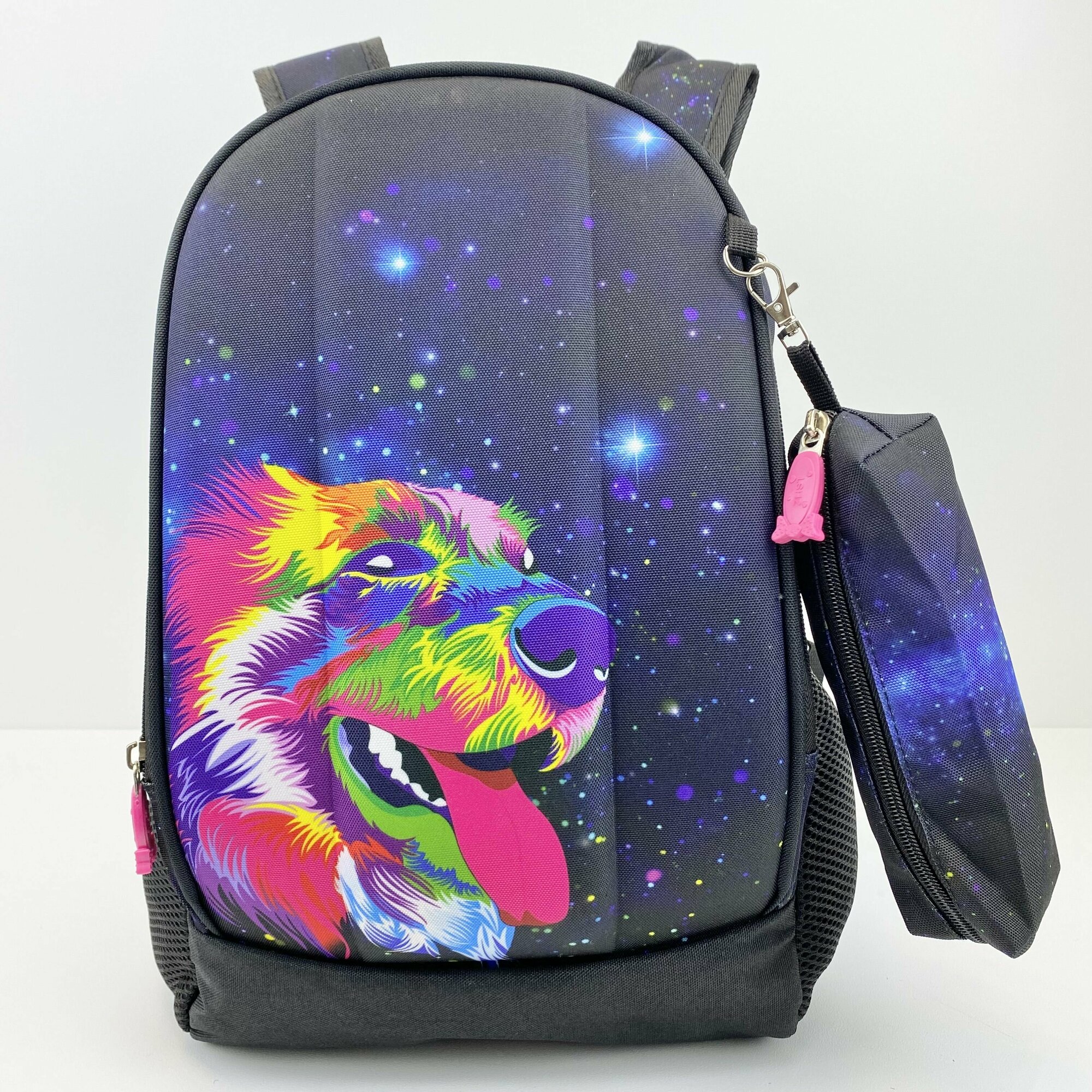 Рюкзак-ранец школьный "Радужный пёс" с пеналом, 20л, 40*30*17, черно-розовый информация: