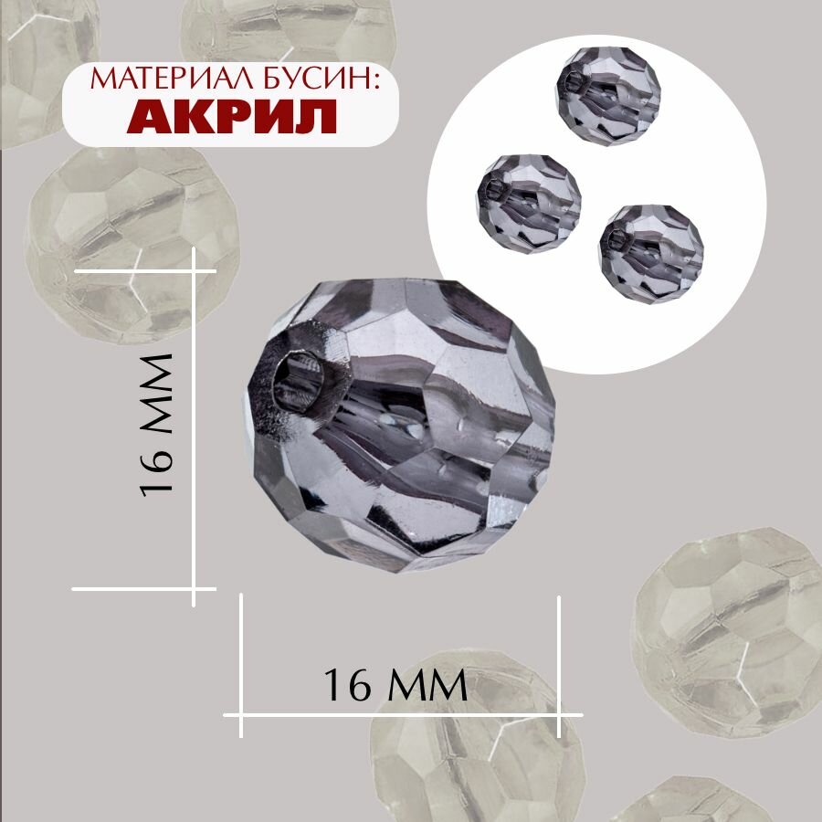 Бусины прозрачные граненые "Шар" 16 мм, серый AD 20, 20 шт. (40 гр.) 348 ₽