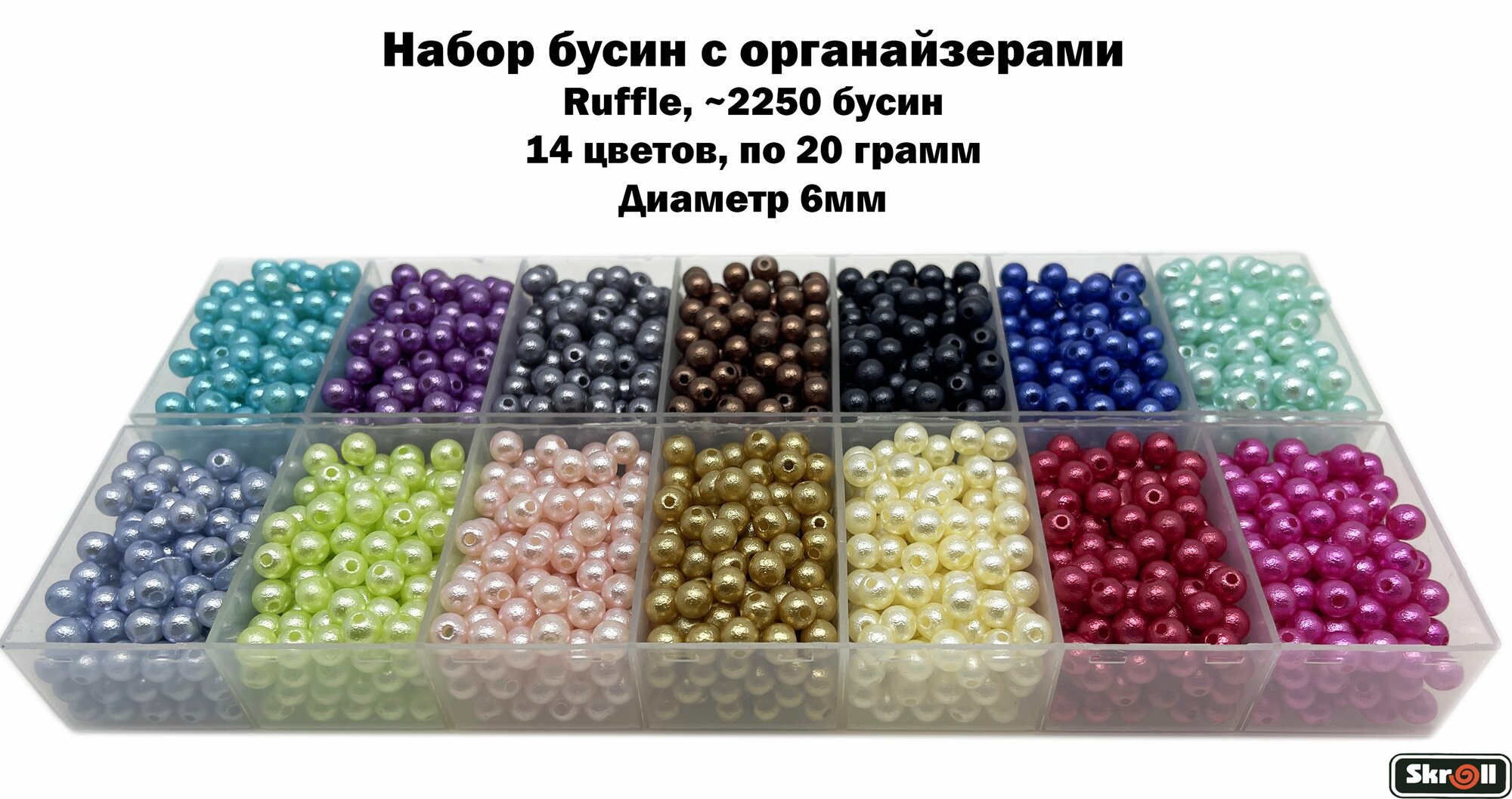 Бусины с органайзерами Ruffle 6 мм 14 цветов по 20 грамм, 2250 бусин/ Skroll информация: