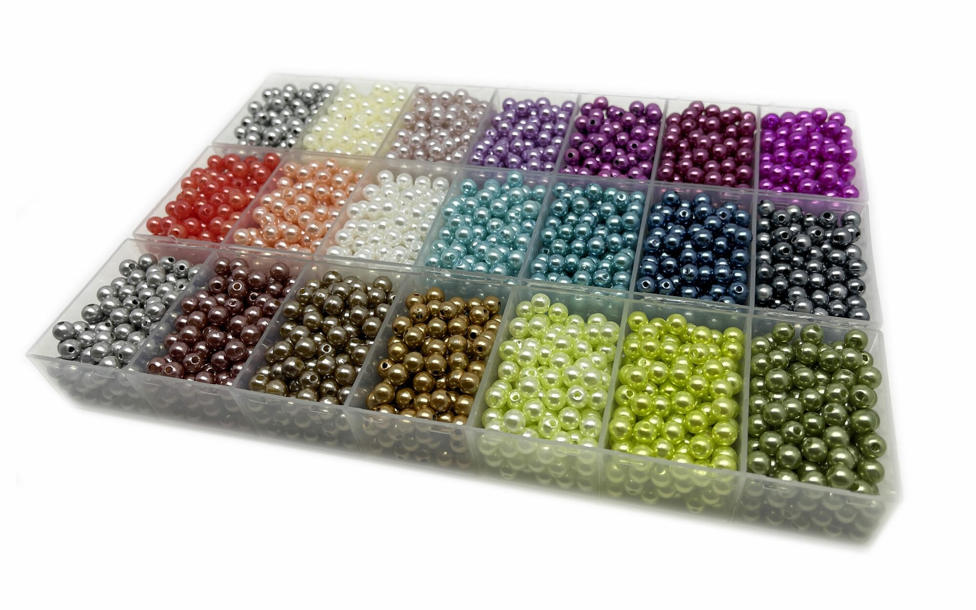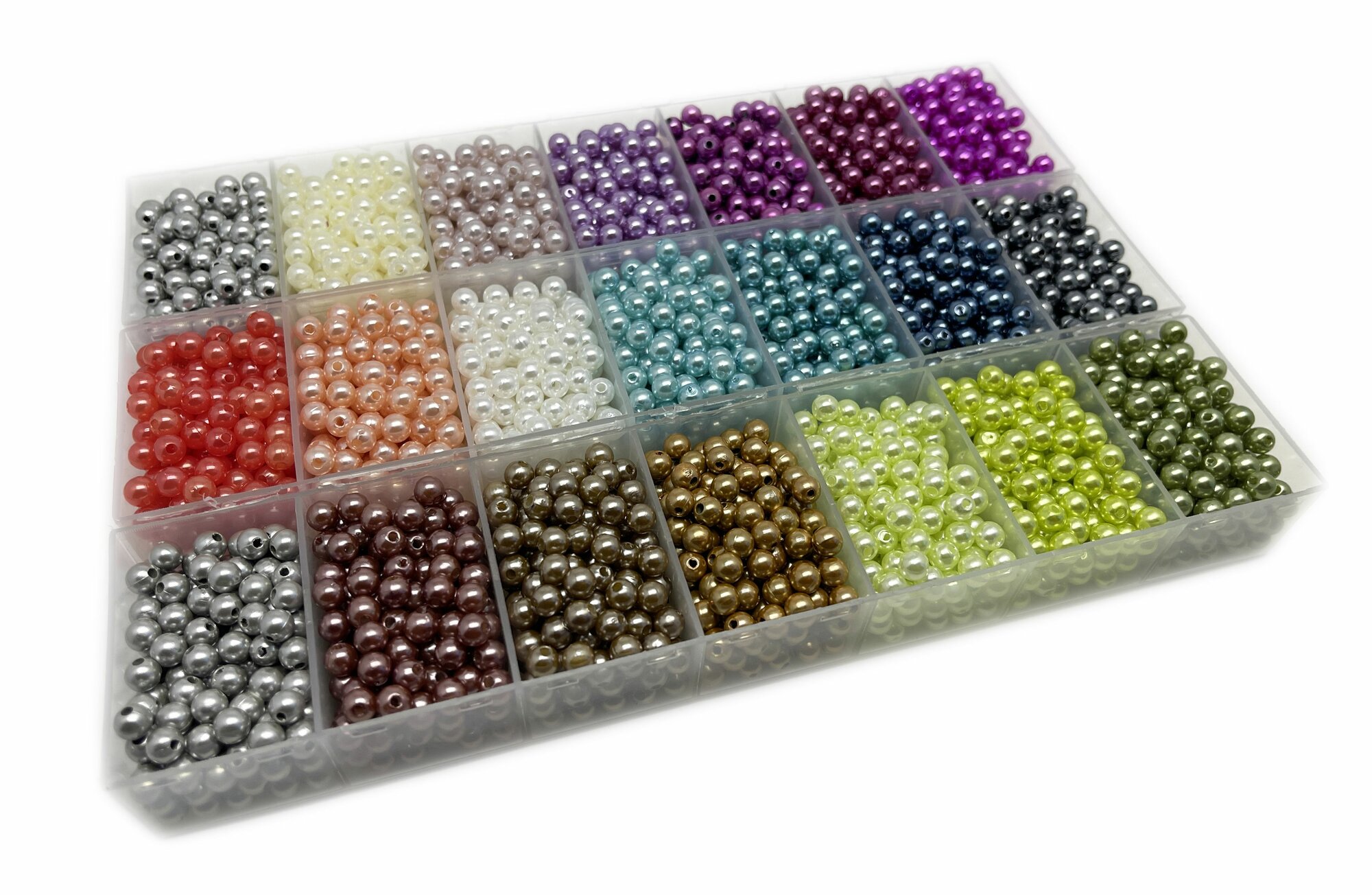 10 цен на Бусины с органайзерами под жемчуг 6 мм 21 цвет по 20 грамм/ 3400 бусин разных цветов/ Skroll