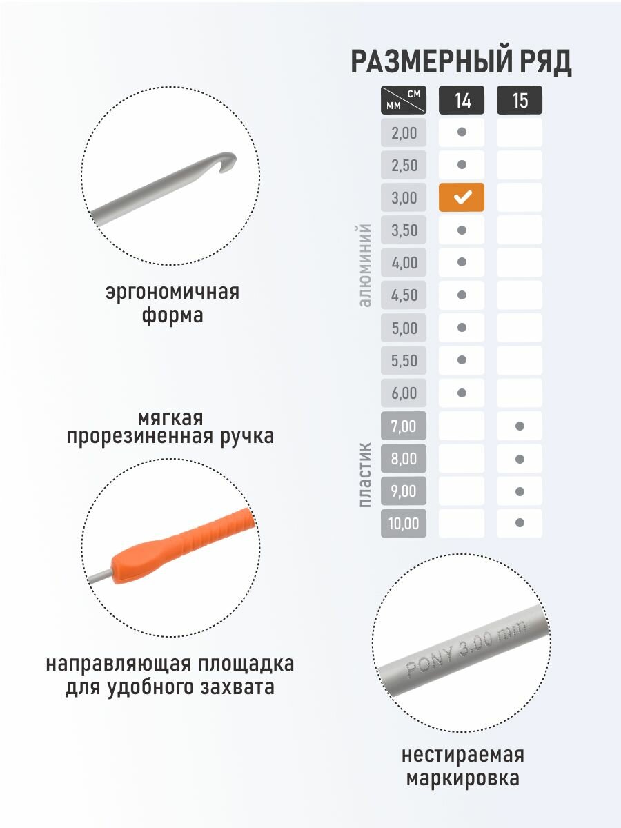 Крючок для вязания с мягкой ручкой, 3мм*14см, алюминий, PONY, 56803 информация:
