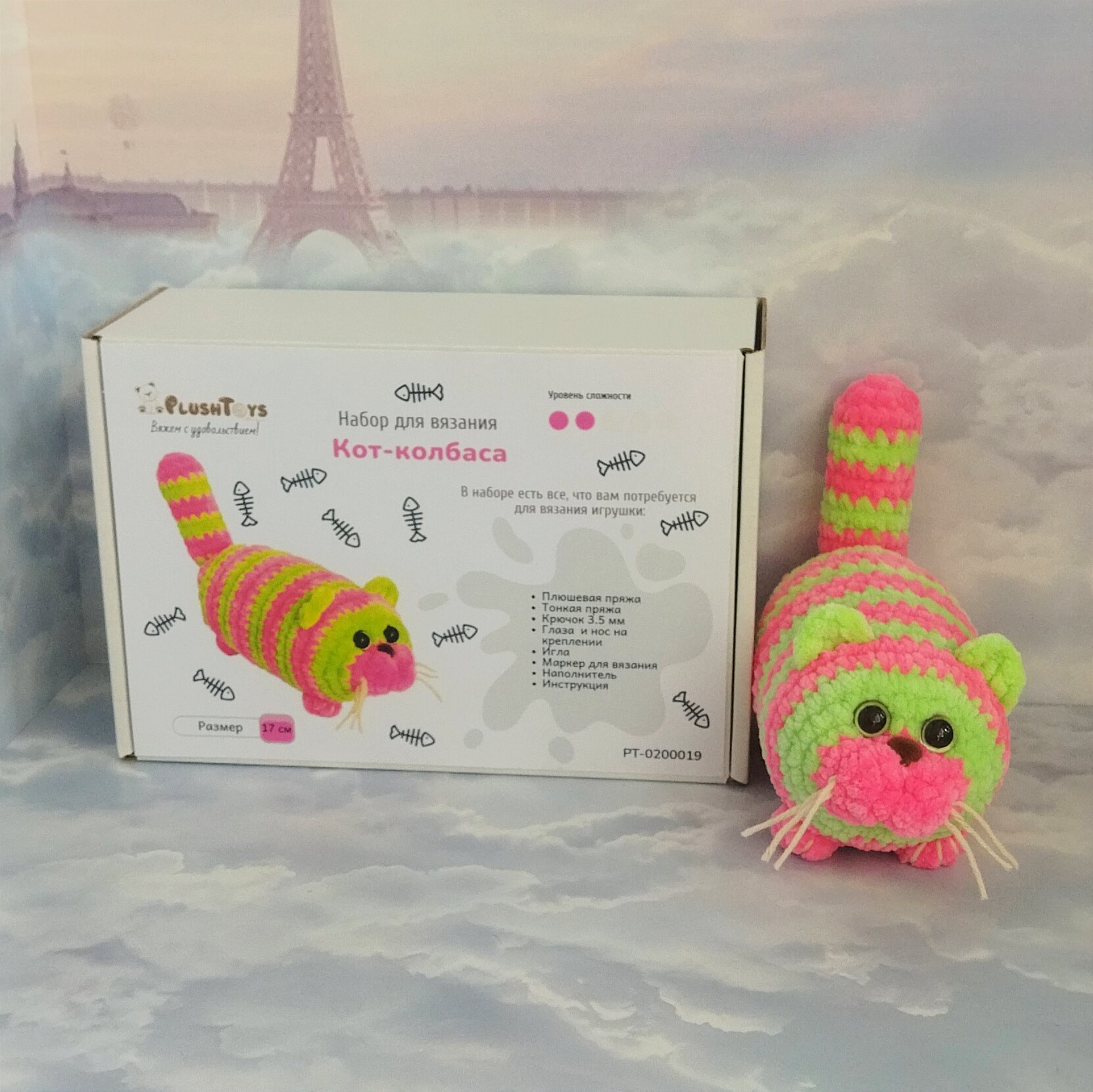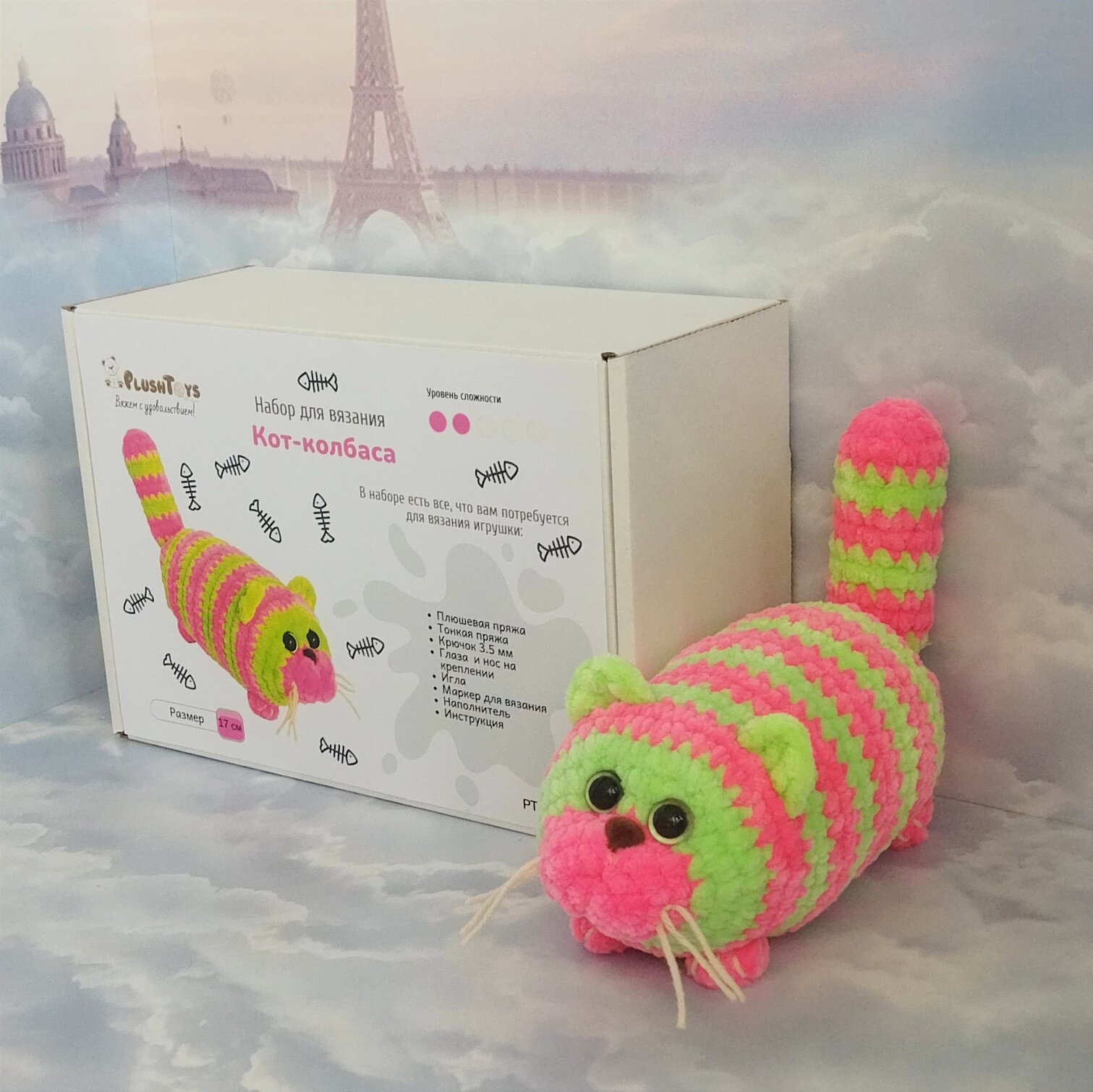 10 цен на Набор для вязания игрушки крючком "Кот Колбаса", 17см, розово-салатовый