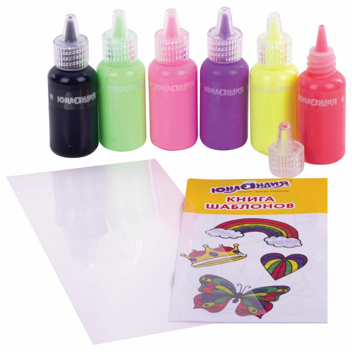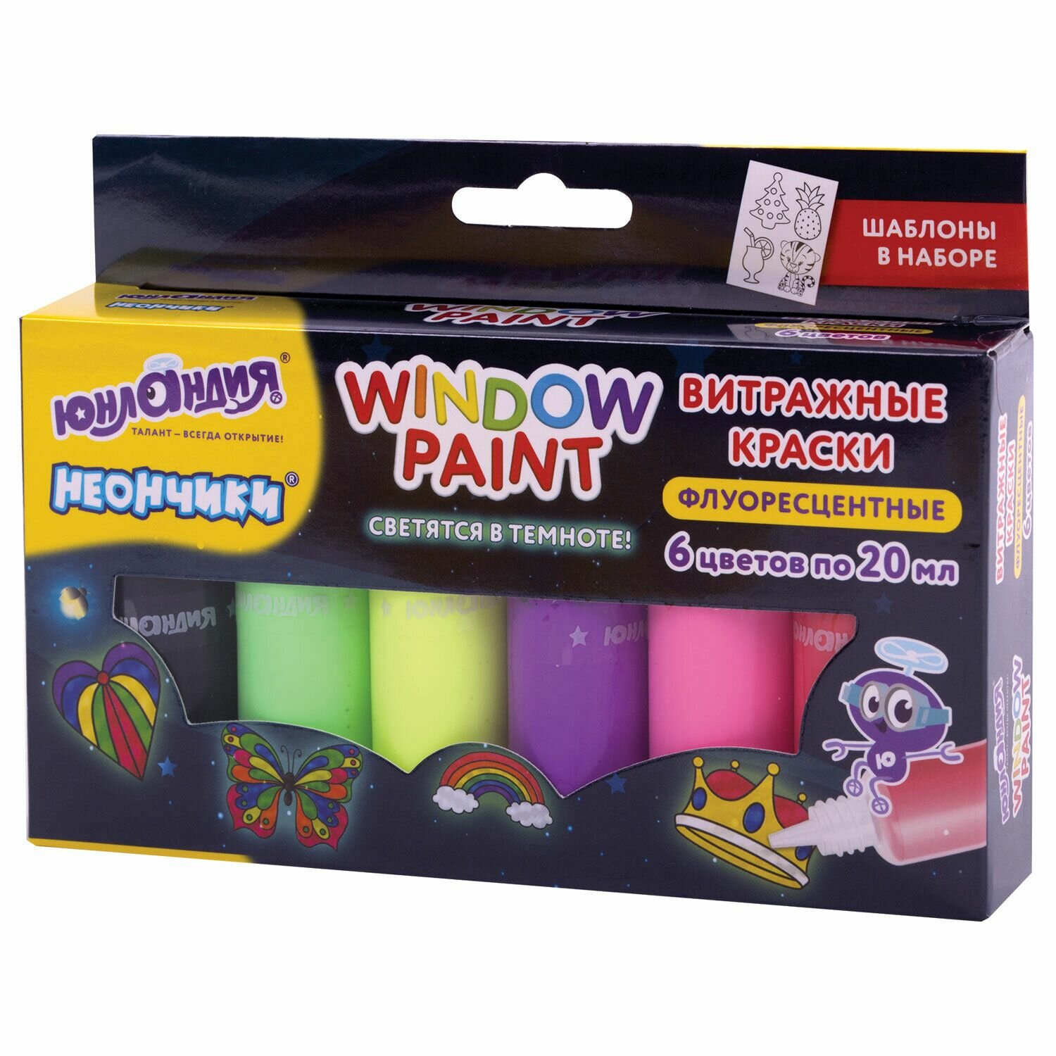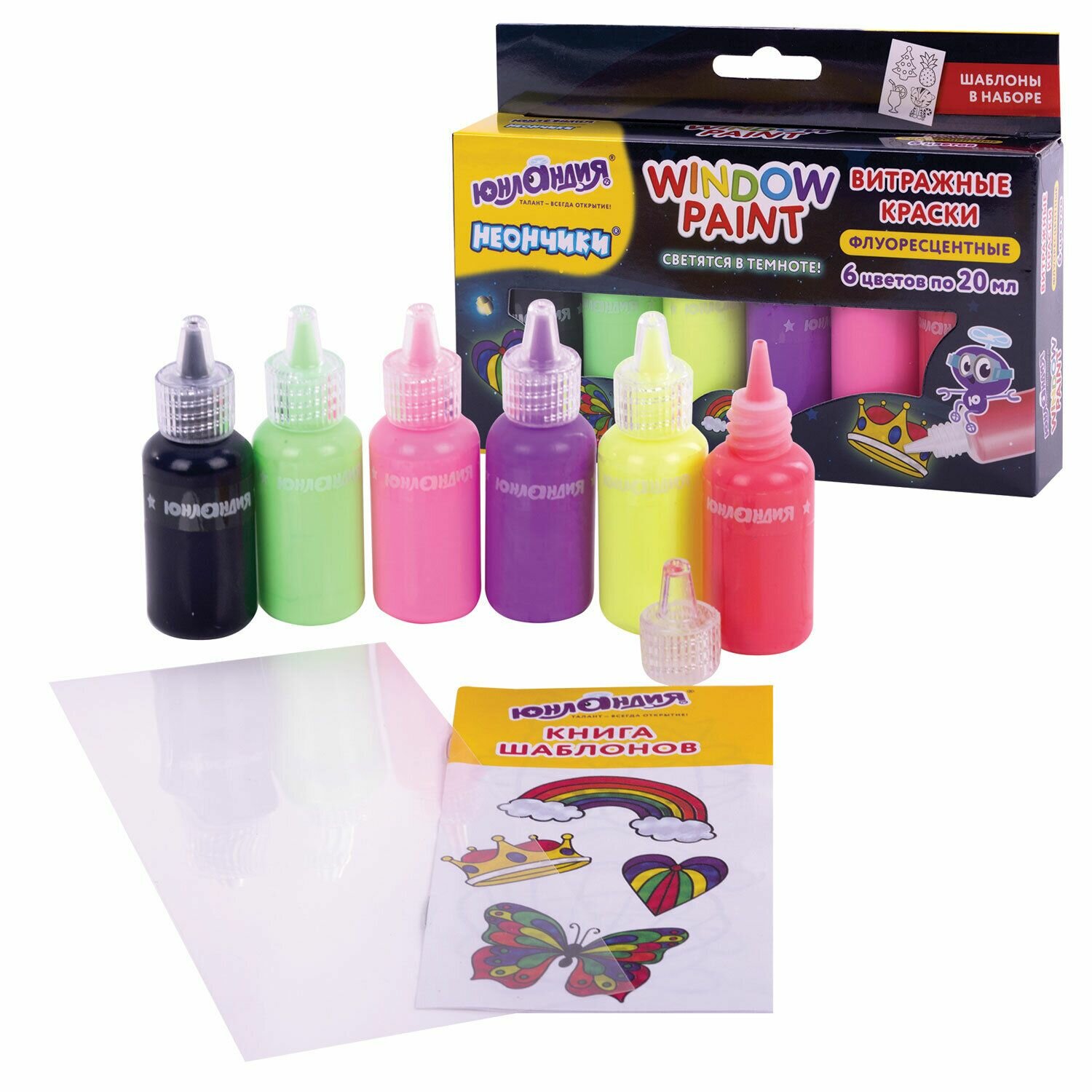 Краски витражные Юнландия "Неончики", 6 цветов, 20 мл, шаблоны (191760) информация: