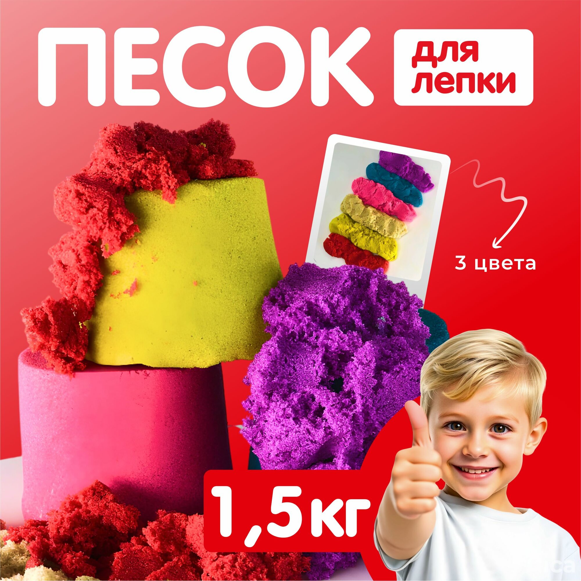 Кинетический песок 1,5 кг POYDA, 3 цвета песка для лепки, подарочный набор для детей информация: