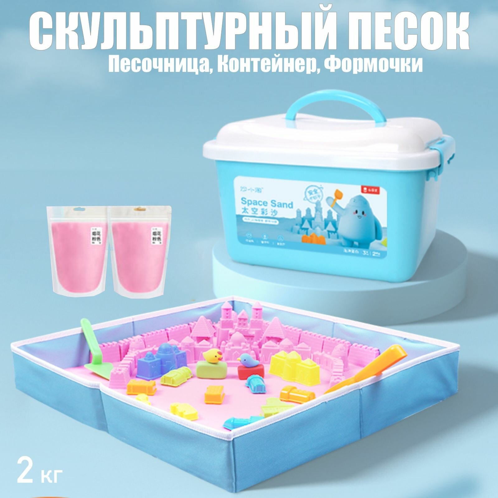Большой набор Скульптурный песок (голубой 2 кг) с песочницей, формочками, лопатками в подарочном контейнере Coloyou 8 147 ₽