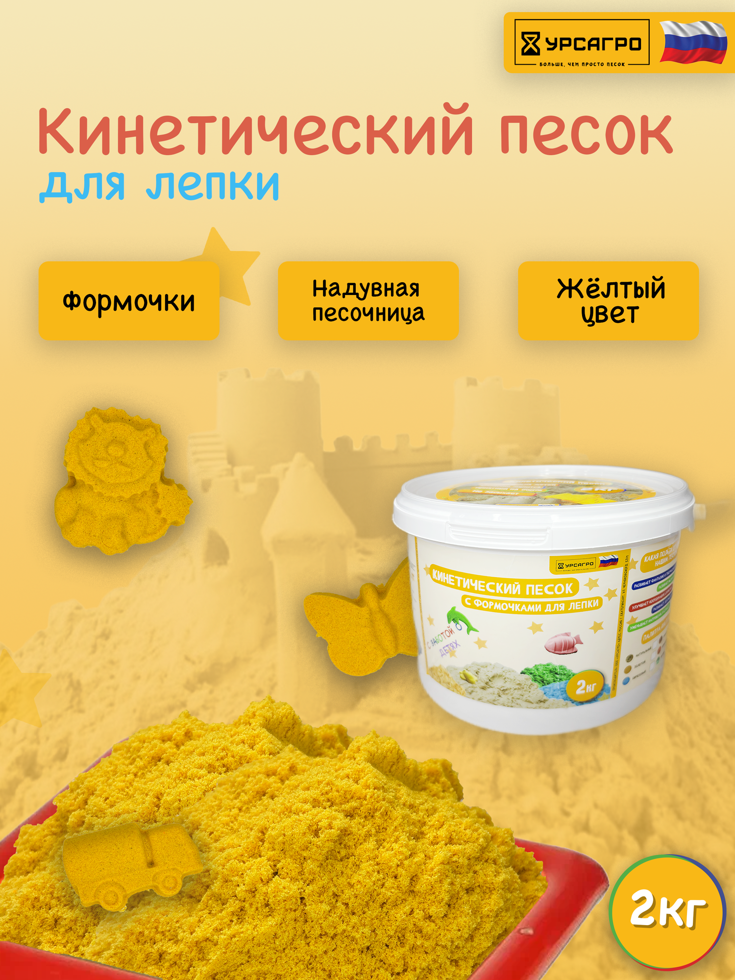 Кинетический песок Урсагро "Жёлтый", с песочницей, формочками, тянущийся, 2 кг информация: