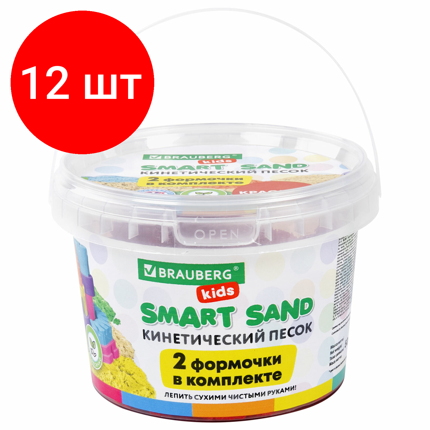 Комплект 12 шт, Песок для лепки кинетический BRAUBERG KIDS, красный, 500 г, 2 формочки, ведерко, 665093 информация: