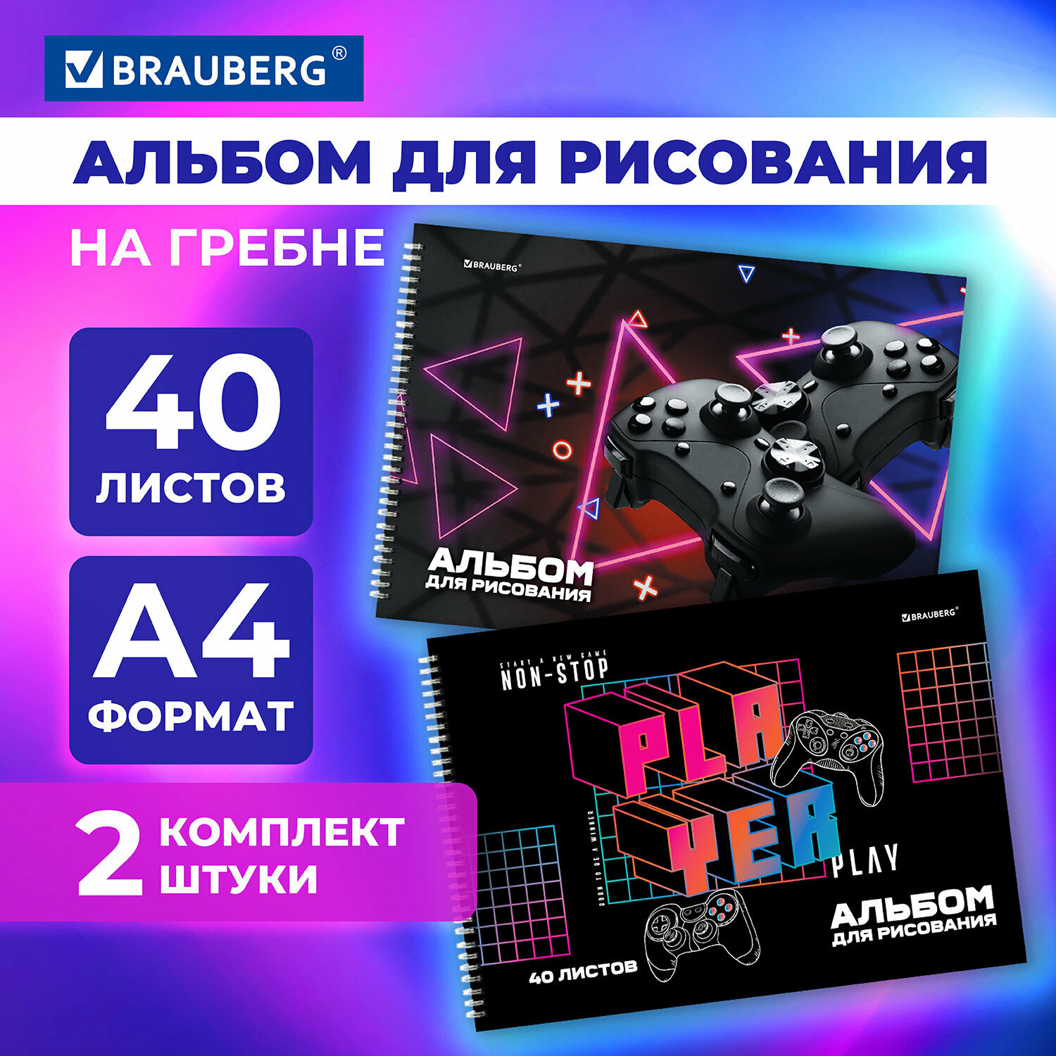 Альбом для рисования 40 листов А4 на спирали, комплект 2 штуки, обложка картон, Brauberg, 205х290 мм, Non-stop, 106738 информация: