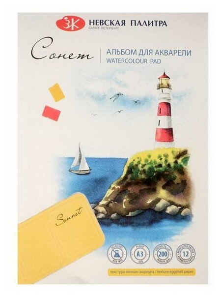 Альбом для акварели Сонет ЗХК Невская палитра, 200 г/м2, А3, 12 листов, 100% целлюлоза, яичная скорлупа информация: