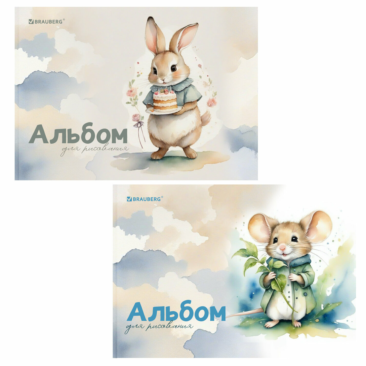 Альбом для рисования в школу А4 40 листов на склейке, набор 2 штуки, обложка картон, Brauberg Зверьки, 107018 297 ₽
