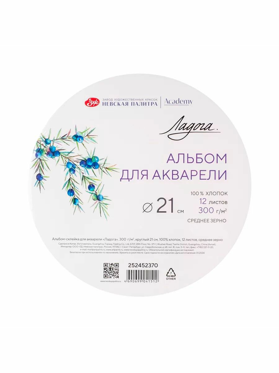 Альбом для рисования Невская палитра Ладога, круглый 21 см, 100% хлопок, среднее зерно, 12 листов 252452370 информация: