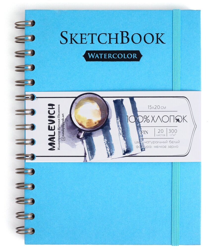 Скетчбук Малевичъ для акварели, 100% хлопок, лазурный, спираль, 300 г/м, 15х20 см, 20л информация: