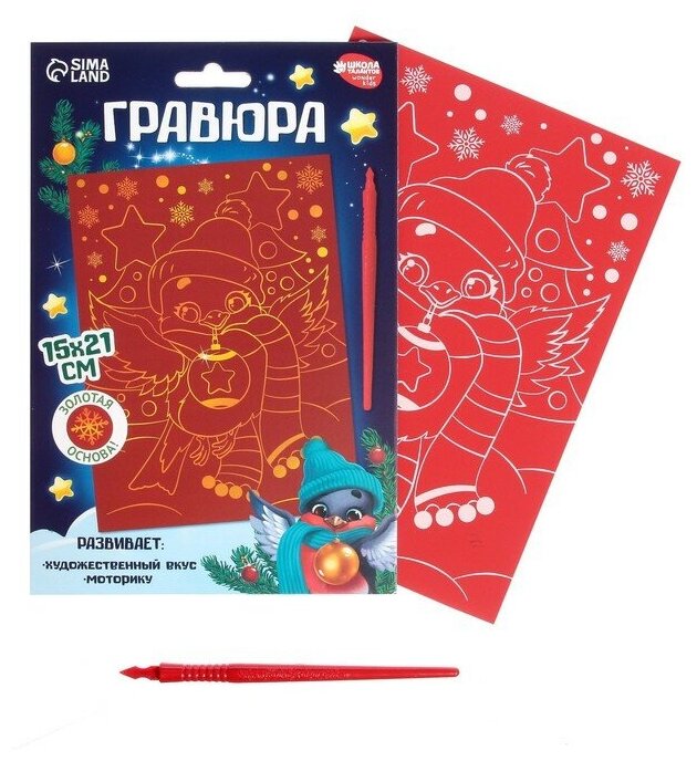 Гравюра «Снегирь в шапке» с металлическим эффектом «золото», А5, 2 штуки информация: