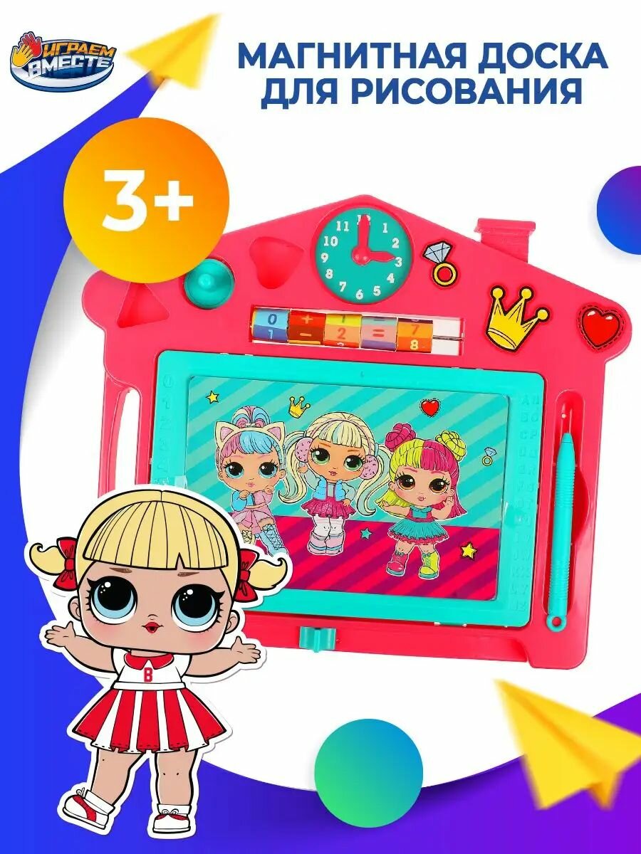 Отзывы на Детская доска для рисования магнитная Принцессы Лол Играем вместе / счеты + часы + 3 штампа