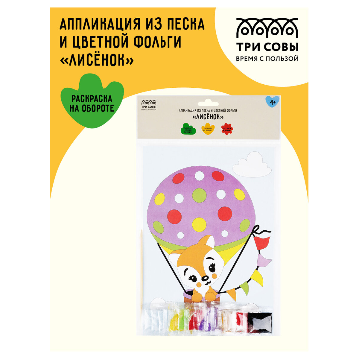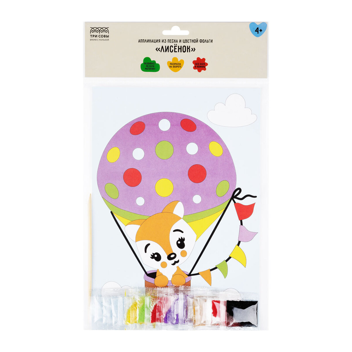 Аппликация из песка и цветной фольги ТРИ совы "Лисенок", с раскраской, пакет с европодвесом, 2 штуки информация: