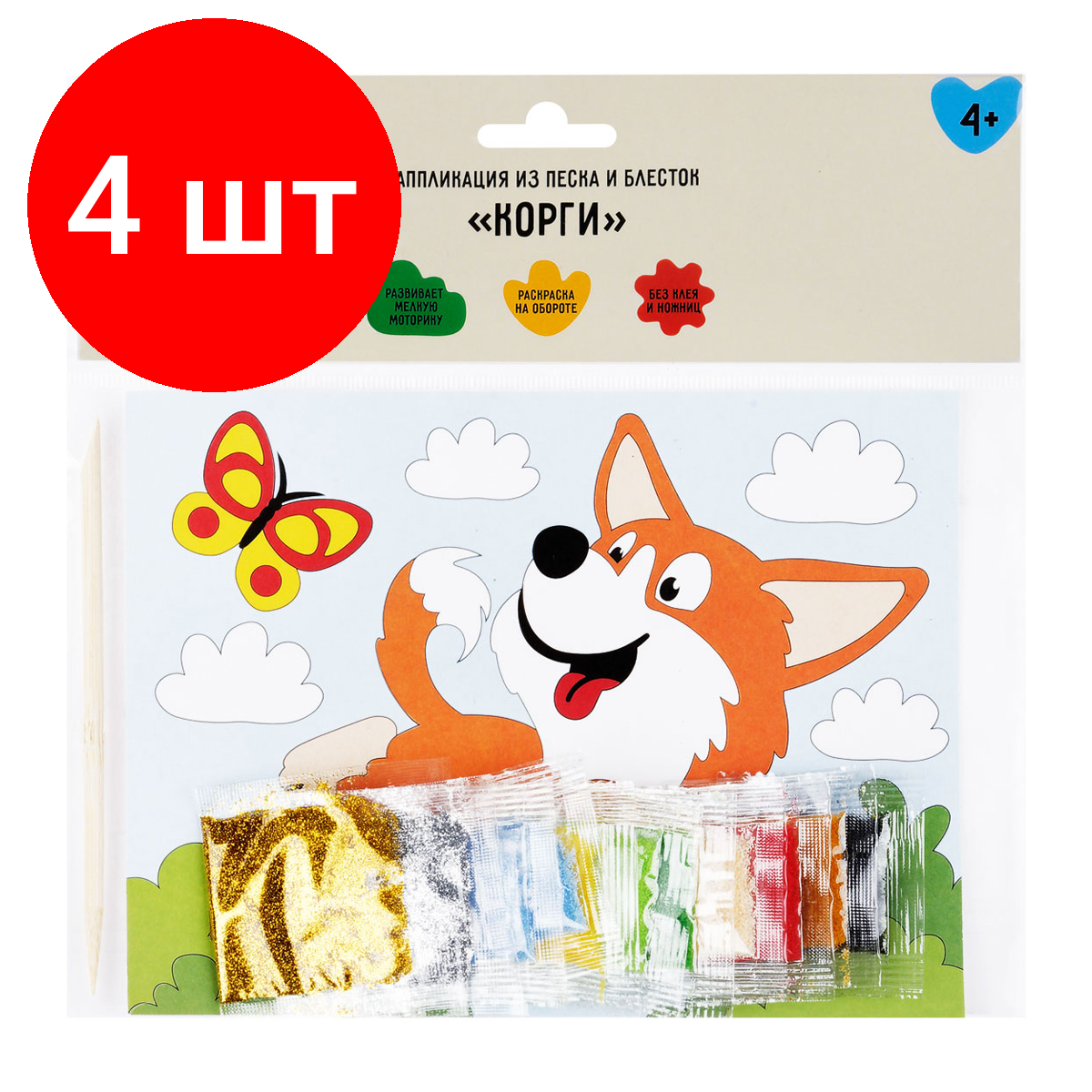 10 цен на Комплект 4 шт, Аппликация из песка и блесток ТРИ совы "Корги", с раскраской, пакет с европодвесом