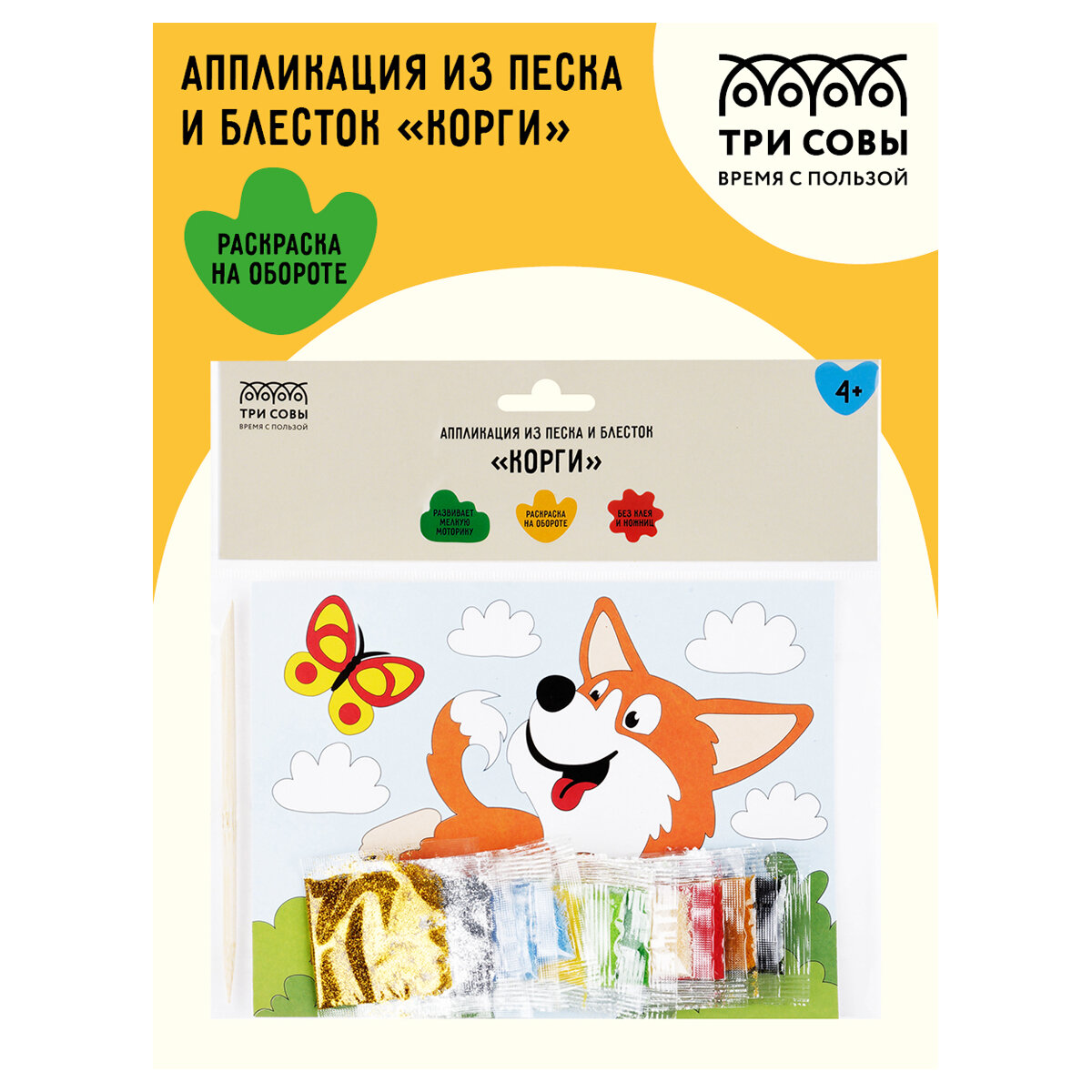 Комплект 4 шт, Аппликация из песка и блесток ТРИ совы "Корги", с раскраской, пакет с европодвесом информация: