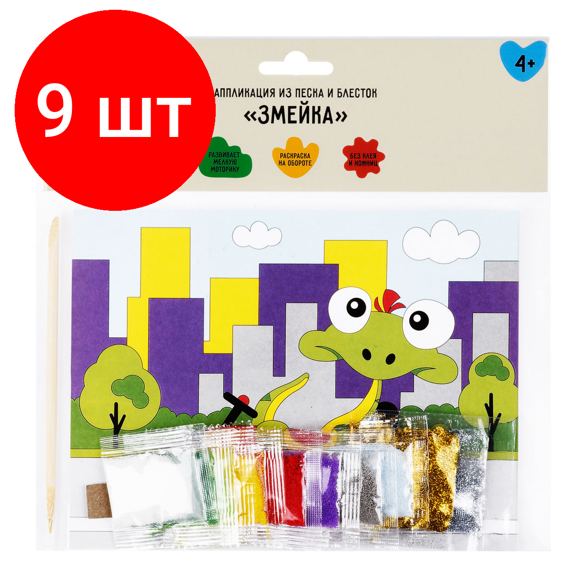 10 цен на Комплект 9 шт, Аппликация из песка и блесток ТРИ совы "Змейка", с раскраской, пакет с европодвесом