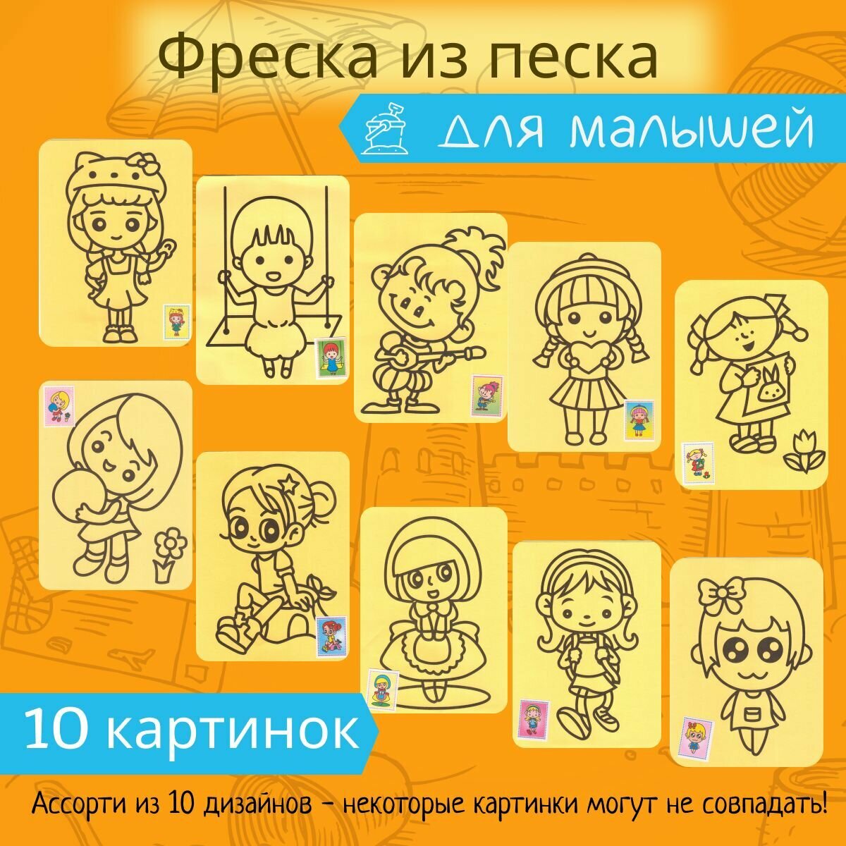 Фреска из песка для детей набор 10 штук Раскраска картинка песочная Ассорти 15*21 см, песок 6 цветов, Р-282 информация: