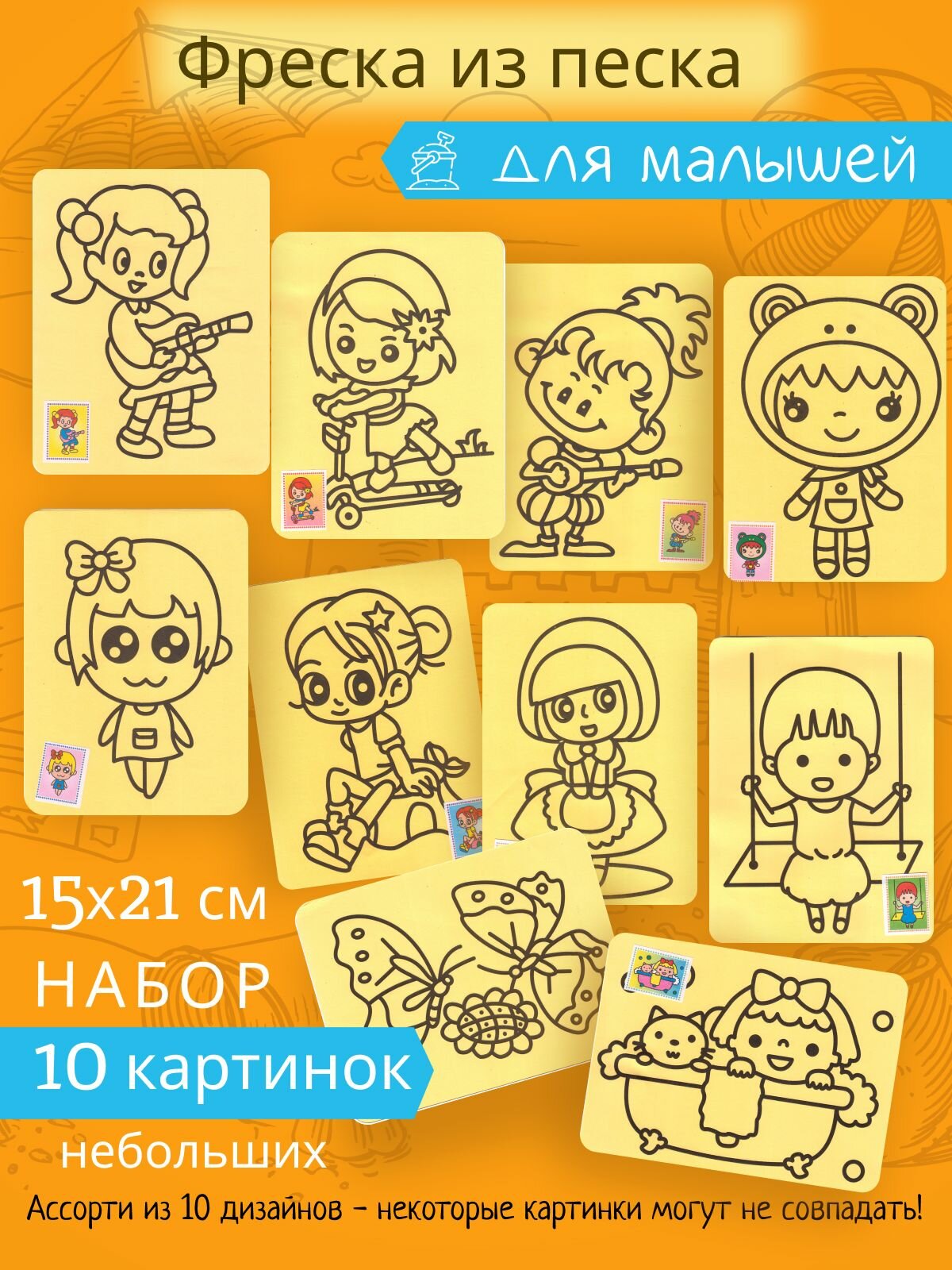 Отзывы на Фреска из песка для малышей Набор 10 штук Раскраска песочная Ассорти. Картинки 15*21 см, песок 6 цветов