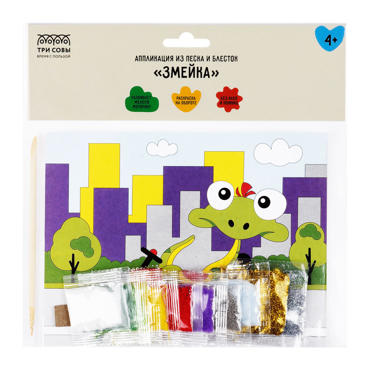 Отзывы на Комплект 18 шт, Аппликация из песка и блесток ТРИ совы "Змейка", с раскраской, пакет с европодвесом