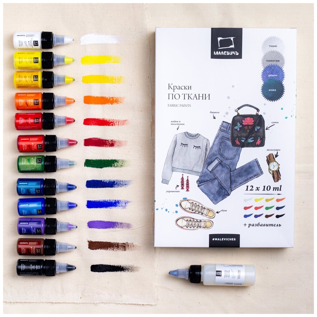 Акриловые краски по ткани Малевичъ 12 цветов по 10 мл + разбавитель информация: