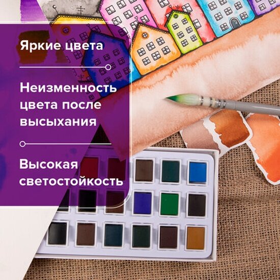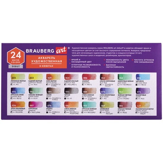 Акварель художественная Brauberg в кюветах набор 24 цвета по 2,5 г, ART DEBUT, 191778 информация: