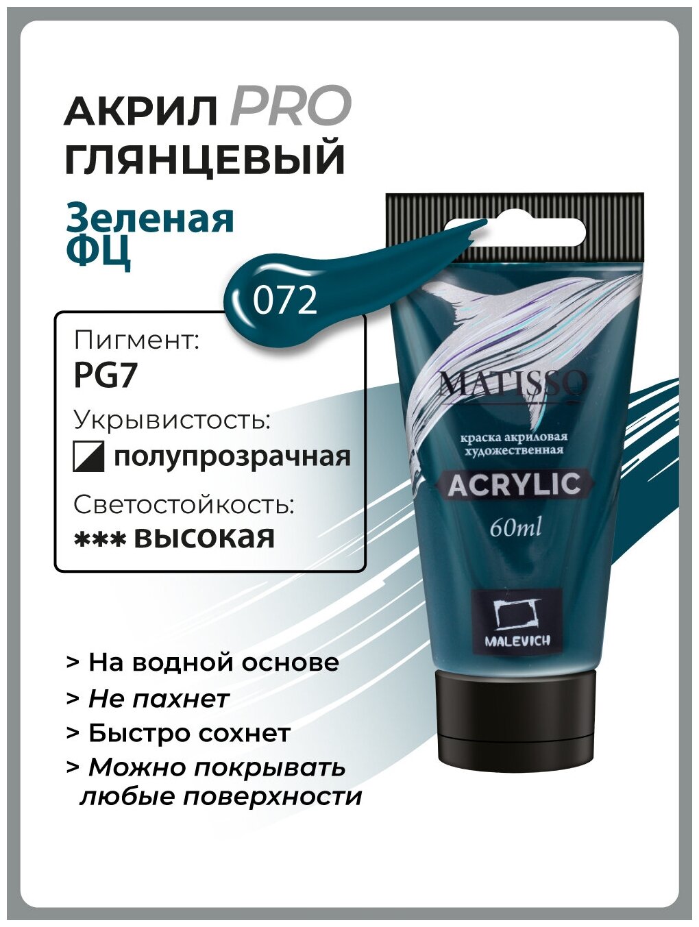 Акриловая краска Малевичъ Matisso, зеленая "ФЦ", акрил глянцевый, 60 мл информация:
