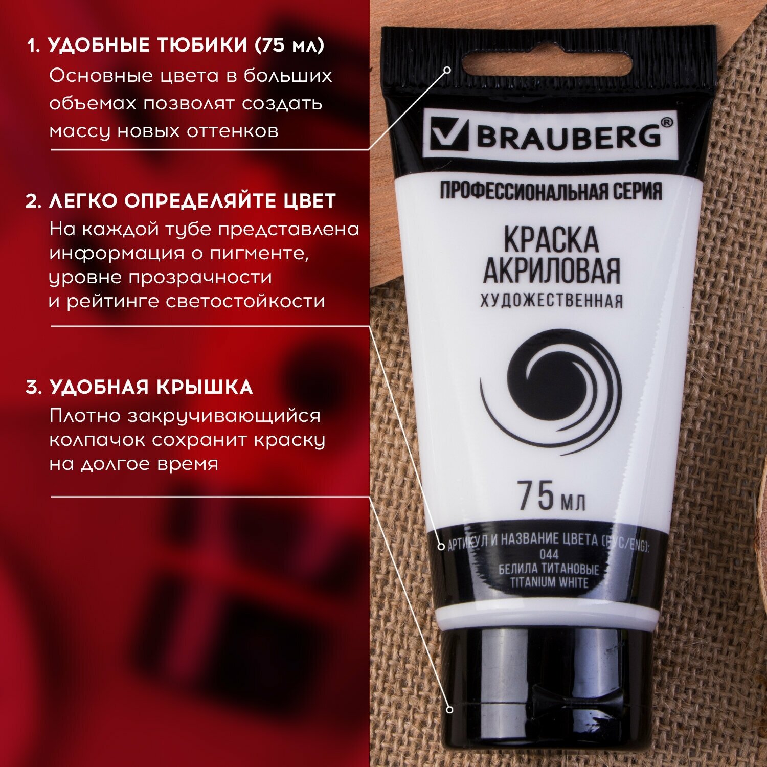 Краски акриловые художественные в тубах для рисования, набор из 6 цветов по 75 мл, Brauberg ART Classic, 191121 информация: