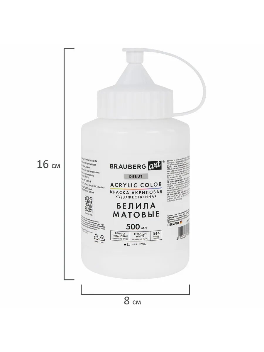 Акриловые краски художественные белые матовые, белила титановые акрил для рисования по холсту, дереву 500 мл в банке, Brauberg Art Debut, 192535 595 ₽