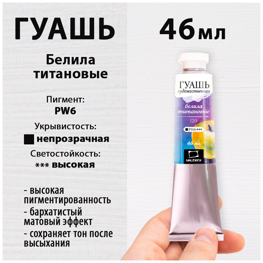 Белая гуашь Малевичъ, белила титановые, туба 46 мл, гуашевая краска поштучно информация: