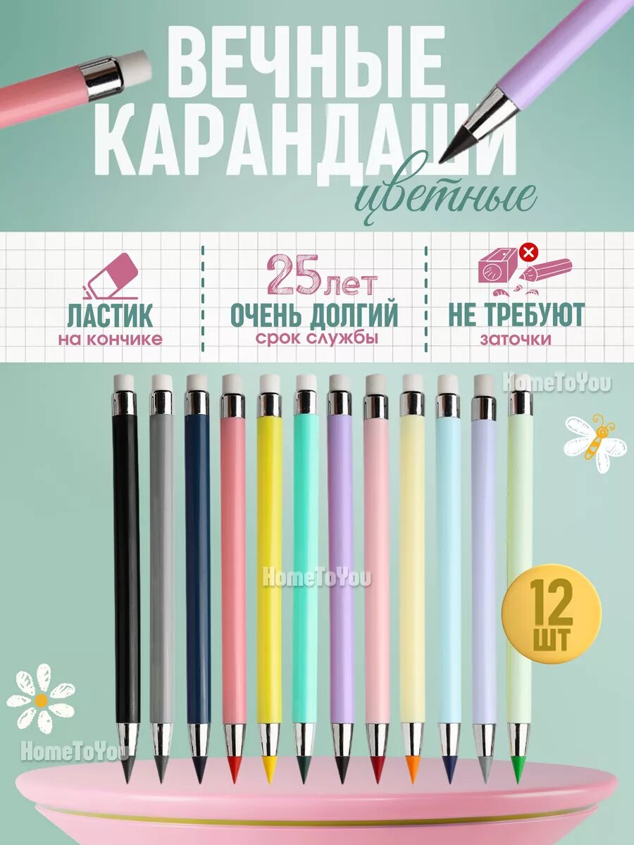 Вечные карандаши HomeToYou, с ластиком и твердым грифелем HB, 24 шт. 499 ₽