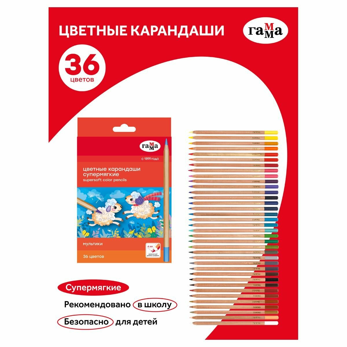 Карандаши цветные Гамма "Мультики", 36цв, супермягкие, увелич. диаметр грифеля 4,0мм, заточен, картон. упак, европодвес информация: