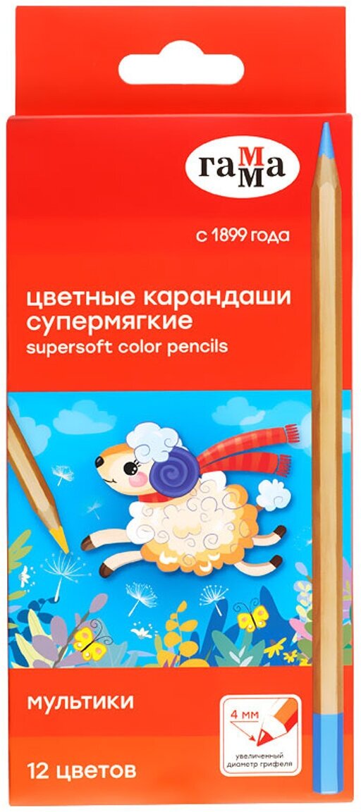 Карандаши цветные Гамма "Мультики" 12 цветов, супермягкие, увелич. диаметр грифеля 4,0мм, заточенный, европодвес, 1 упаковка информация: