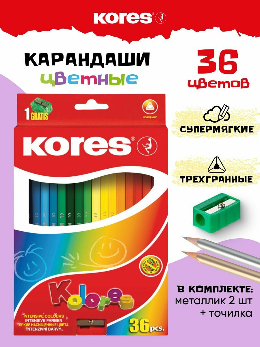 Карандаши цветные Kores, трехгранные, толщина грифеля 2,9 мм, набор 36 цветов, с точилкой информация: