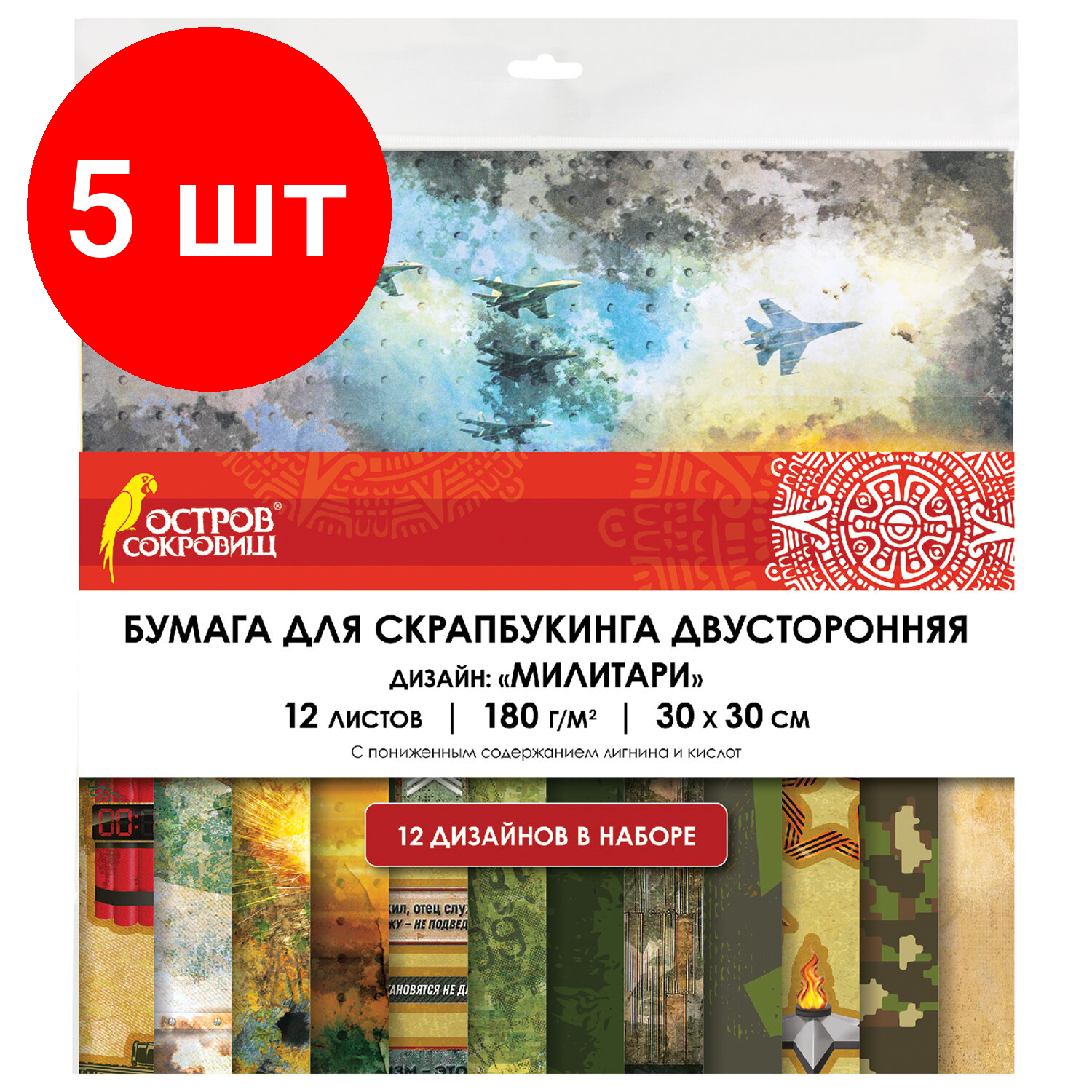10 цен на Комплект 5 шт, Бумага для скрапбукинга 30х30 см "Милитари", двусторонняя, 12 листов, 180 г/м2, остров сокровищ, 665436