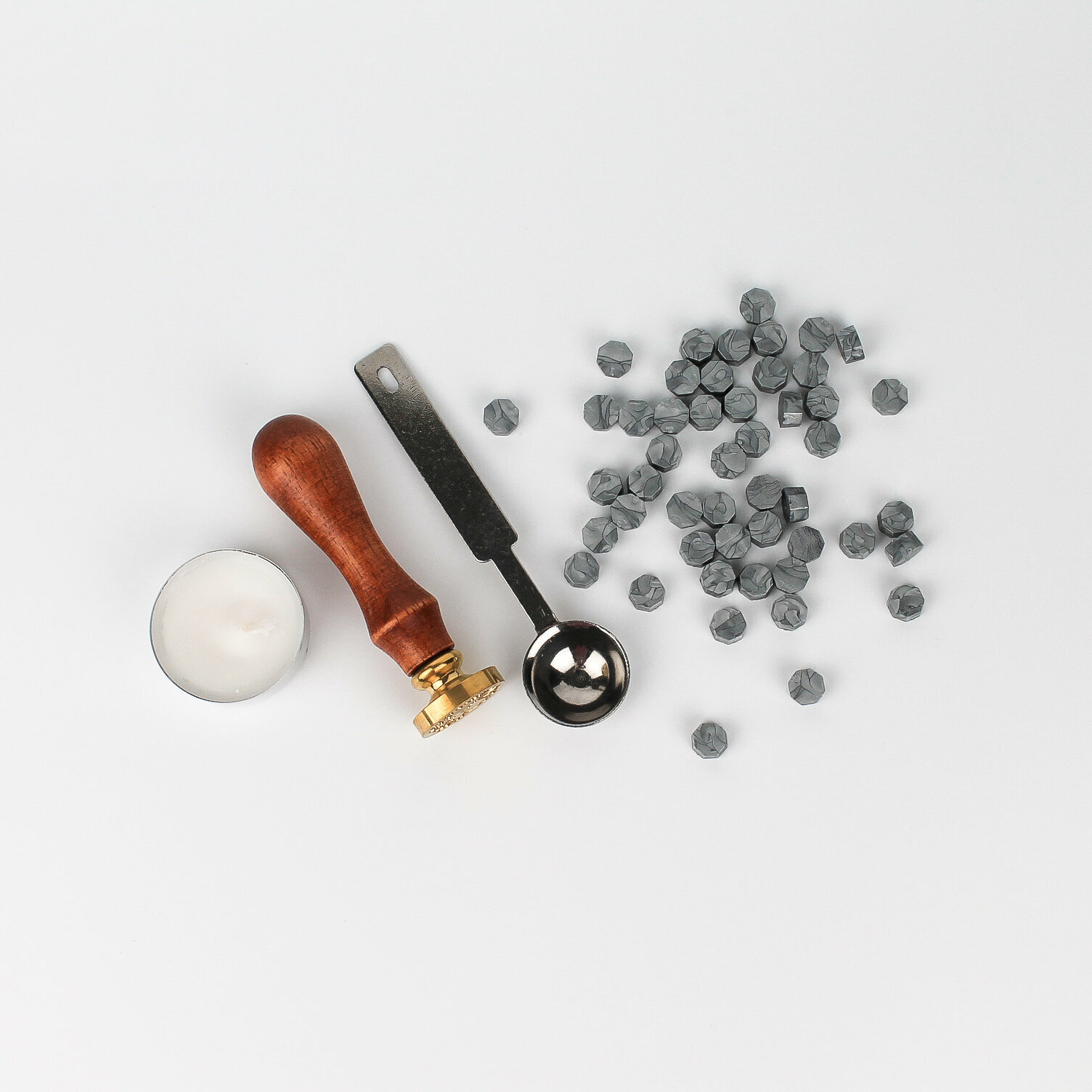 Сургуч в гранулах бронзового цвета с ложкой для плавления и свечой, набор: ложечка с деревянной ручкой, сургуч, свеча 696 ₽