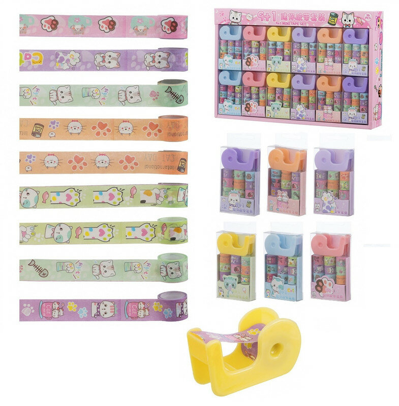 Набор Клейкая лента декоративная Кошки Лапки бумажная 9 лент + диспенсер желтый 342 ₽